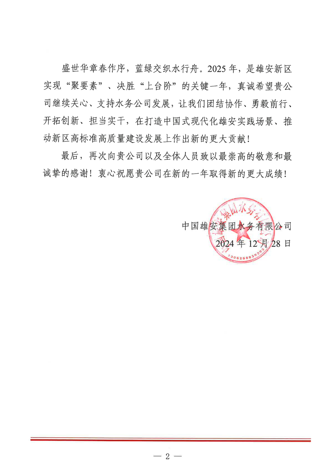 臨近歲末,中國雄安集團水務有限公司向晨天發來感謝信,對企業長期以來參與新區項目建設過程中,做出的不懈努力與取得的系列成果給予高度肯定,并勉勵我司在新的一年里,繼續保持開拓創新精神,發揚擔當實干作風,培育企業新優勢,塑造發展新格局,在新時代新征程里取得更大的突破與成績。