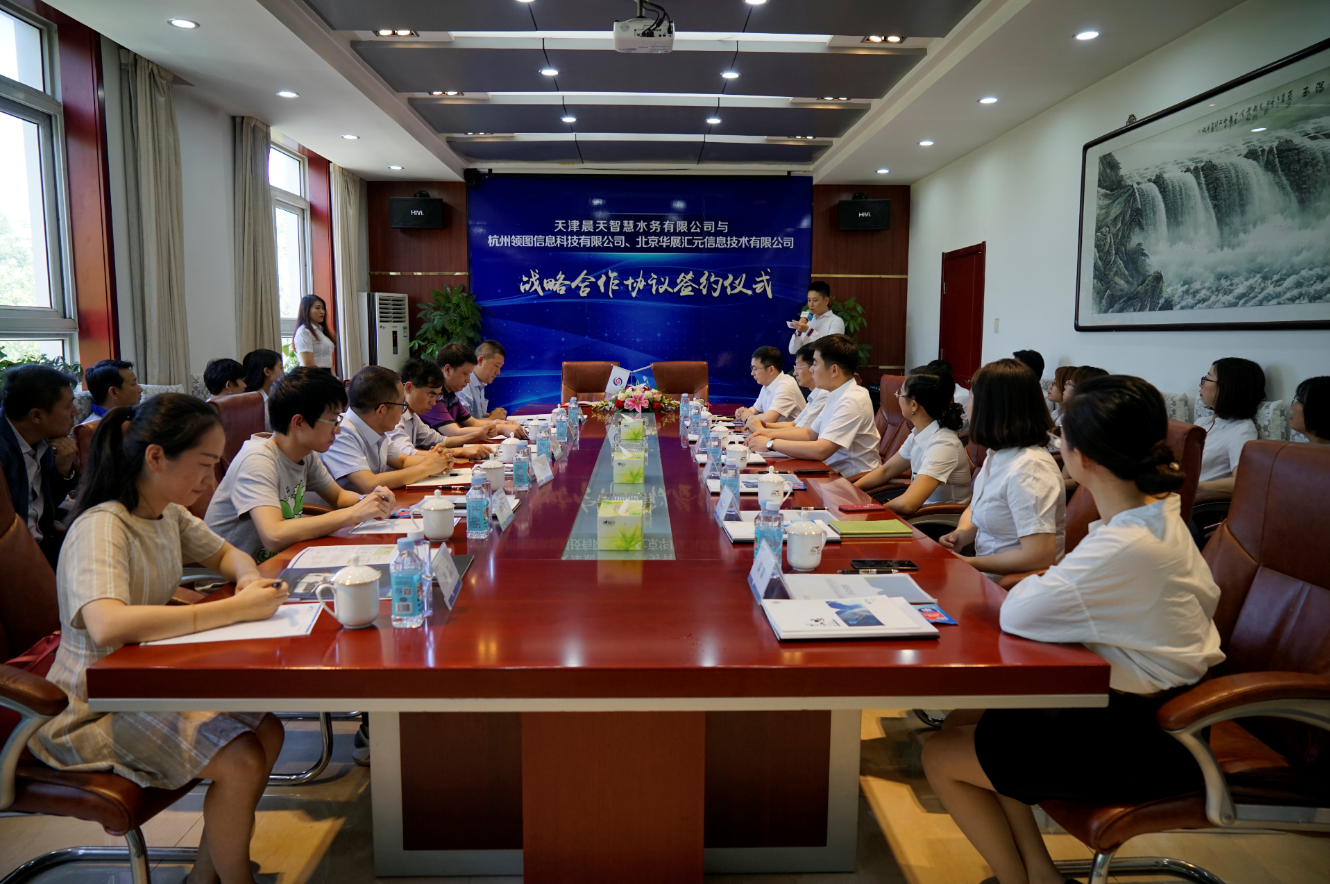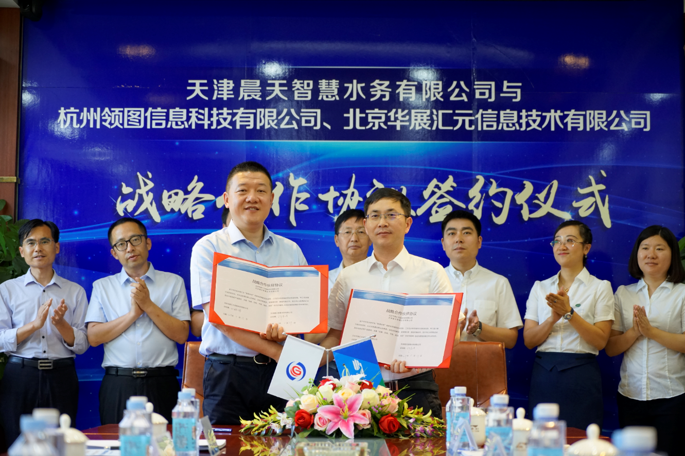 雙方領導在發言后簽約儀式正式啟動,分別簽訂了天津晨天智慧水務有限公司與杭州領圖信息科技有限公司、天津晨天智慧水務有限公司與北京華展匯元信息技術有限公司的合作協議。
