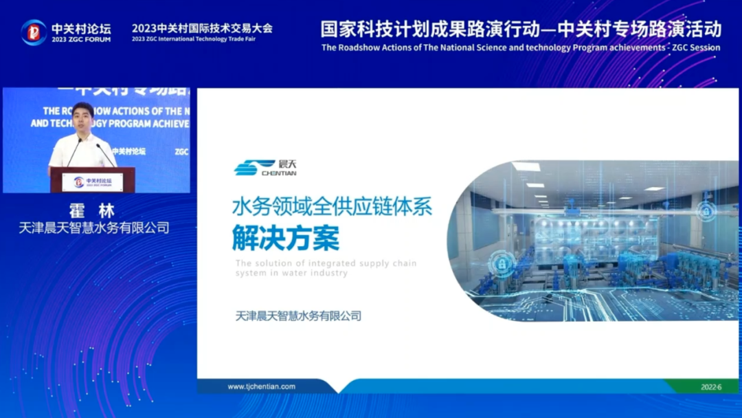 天津晨天智慧水務(wù)總經(jīng)理霍林受邀參加本屆中關(guān)村論壇“國(guó)家科技計(jì)劃成果路演行動(dòng)”并發(fā)表演講。此次活動(dòng)集中推介技術(shù)成熟度高、轉(zhuǎn)化應(yīng)用前景好的高質(zhì)量科技成果,共吸引1000多人次線下參會(huì),98萬(wàn)余人次在線觀看。