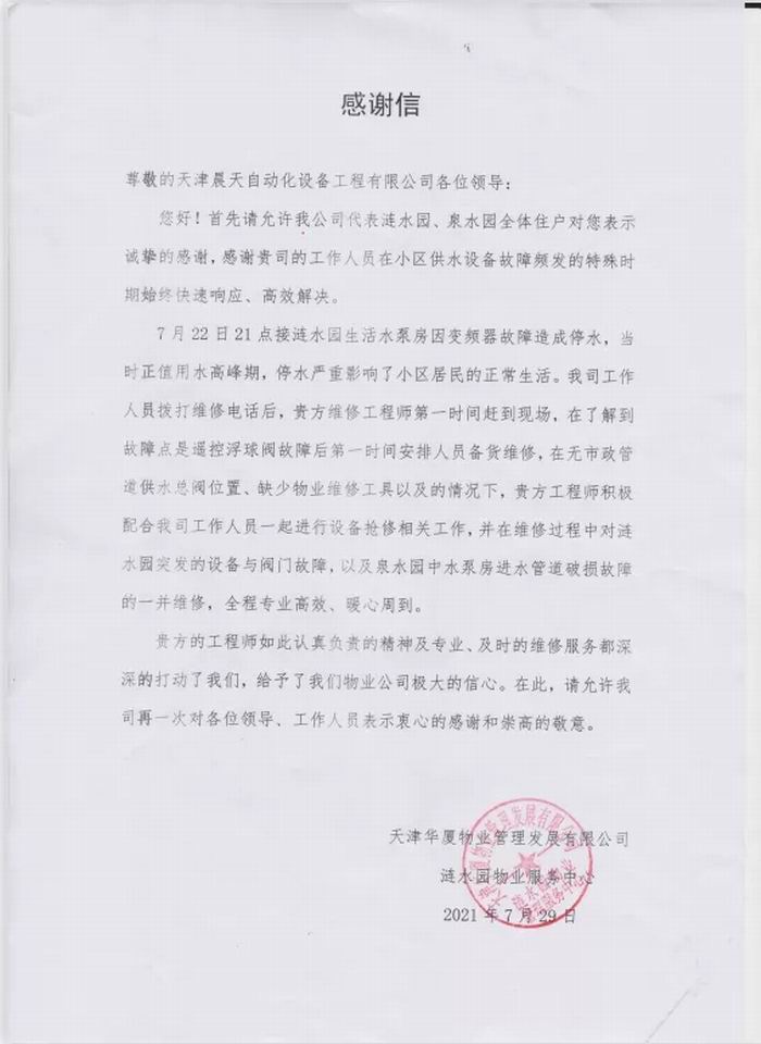 華廈物業(yè)領(lǐng)導(dǎo)此次專程來訪晨天,在對晨天維保運(yùn)營團(tuán)隊(duì)贈(zèng)予了感謝信和錦旗的同時(shí),也表達(dá)出,在與晨天合作的13年中,華廈物業(yè)一直很信賴晨天維保運(yùn)營團(tuán)隊(duì)的技術(shù)水平與專業(yè)能力。尤其是晨天人在工作中始終如一的認(rèn)真態(tài)度,讓他們覺得放心、踏實(shí),更值得托付重任。