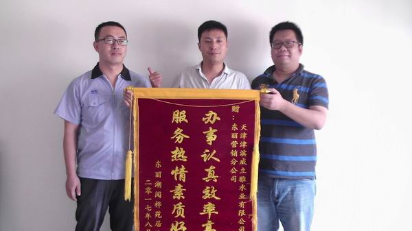 天津市東麗湖閱樺苑小區(qū)4年以來一直水壓不穩(wěn),給業(yè)主日常用水造成很大困擾。晨天公司接受后從服務(wù)態(tài)度到設(shè)備維修上做了很大提升,解決了閱樺苑小區(qū)全體業(yè)主4年以來用水問題上的心病。全體業(yè)主制作了一面錦旗表示感謝!